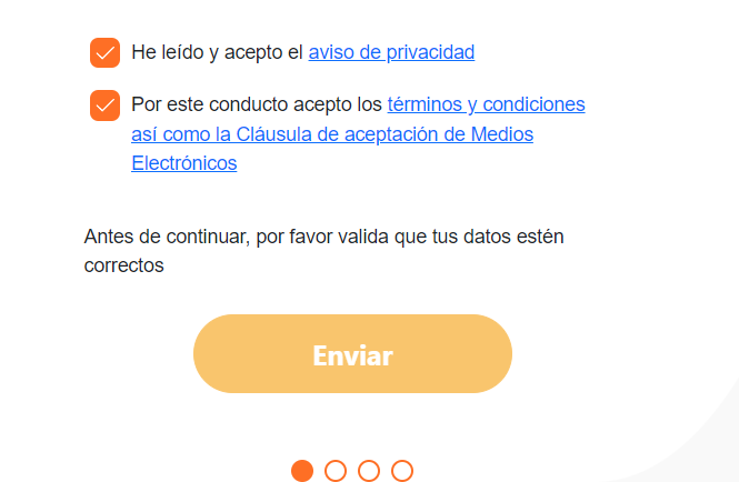 Verifica minuciosamente que tus datos estén correctos, y una vez revisado todo; haz clic en el botón amarillo que dice «Enviar». Así podremos continuar a la siguiente pantalla ó paso 3. Nota: si tienes dudas sobre el aviso y demás cláusulas, puedes hacer clic en los enlaces marcados en color azul para que te despliegue un PDF con la información completa.