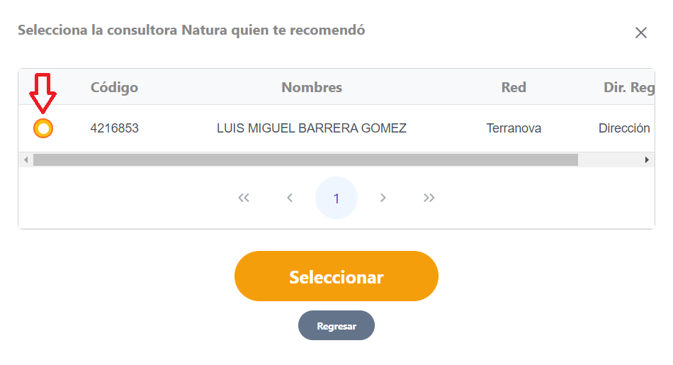 Es muy importante que le des clic a la lupa de color naranja que aparece debajo de los campos de «código y nombre» de Líder, para que el sistema se encargue de buscarlo y sobre todo validar que en verdad existe en Natura México. Una vez que has hecho clic en la lupita, te saldrá una venta emergente en la cual debes de marcar la casilla redonda que se encuentra al lado izquierdo del código del Líder.