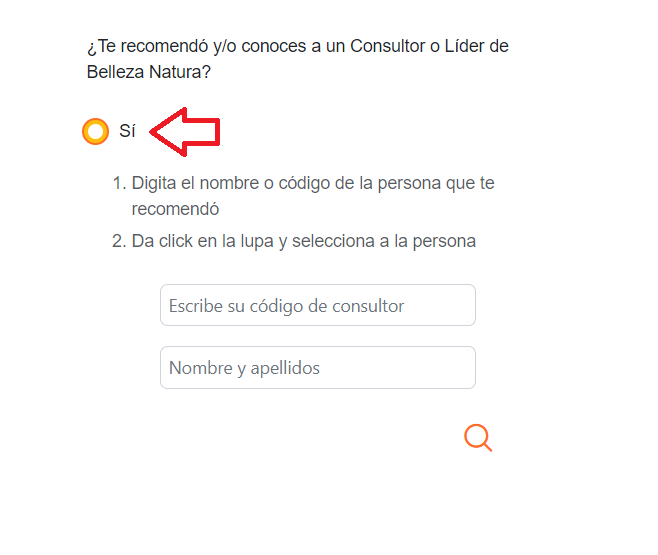 En ésta misma pantalla, nos pedirá los datos de tu líder Natura sí fue la persona que te dio atención por primera vez ó te recomendó. Por lo cual deberás indicar su código y nombre en donde te hace la pregunta. Seleccionas «Sí» como respuesta y te aparecerán los campos correspondientes. Es importante que selecciones un Líder para que te apoye en todo momento y sea más fácil tu inicio con Natura.