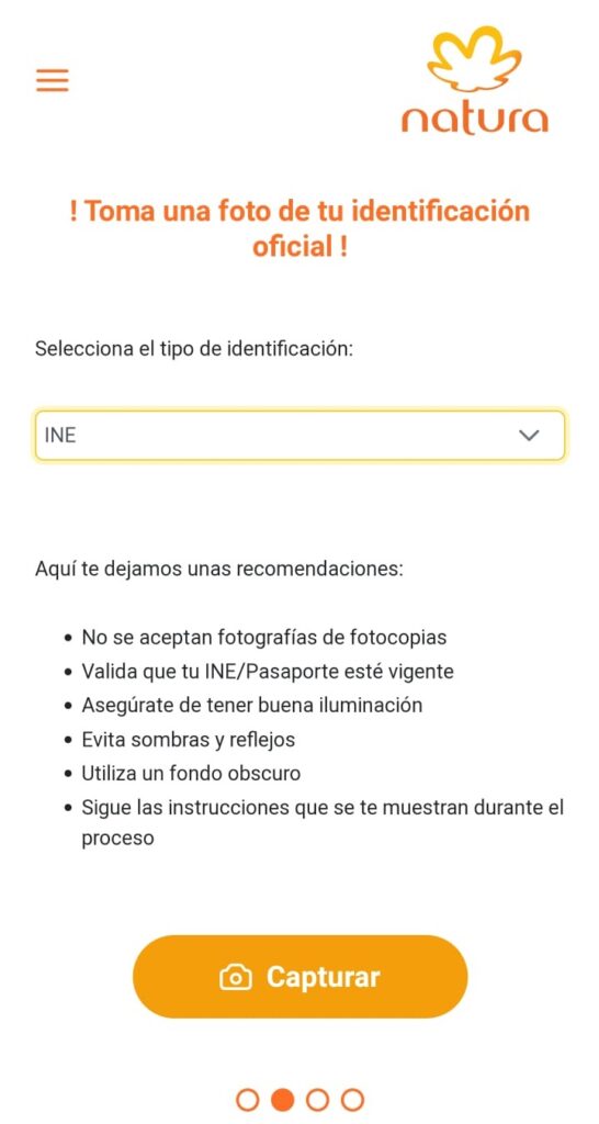 Es momento de tomar foto a tu INE ó Pasaporte para continuar con tu inscripción a Natura. Para mayor comodidad, puedes hacer todo el proceso desde el Paso 1 para que ya tengas a la mano tu cámara y así tomarle fotos a tu INE sea muy sencillo. Una vez que hayas tomado las fotos, deberás subirlas al sistema para validación. Finalizado éste paso, enseguida podrás ingresar los datos de tu domicilio de entrega, así como datos de facturación, evaluación de crédito y finalmente la finalización de tu solicitud de registro.